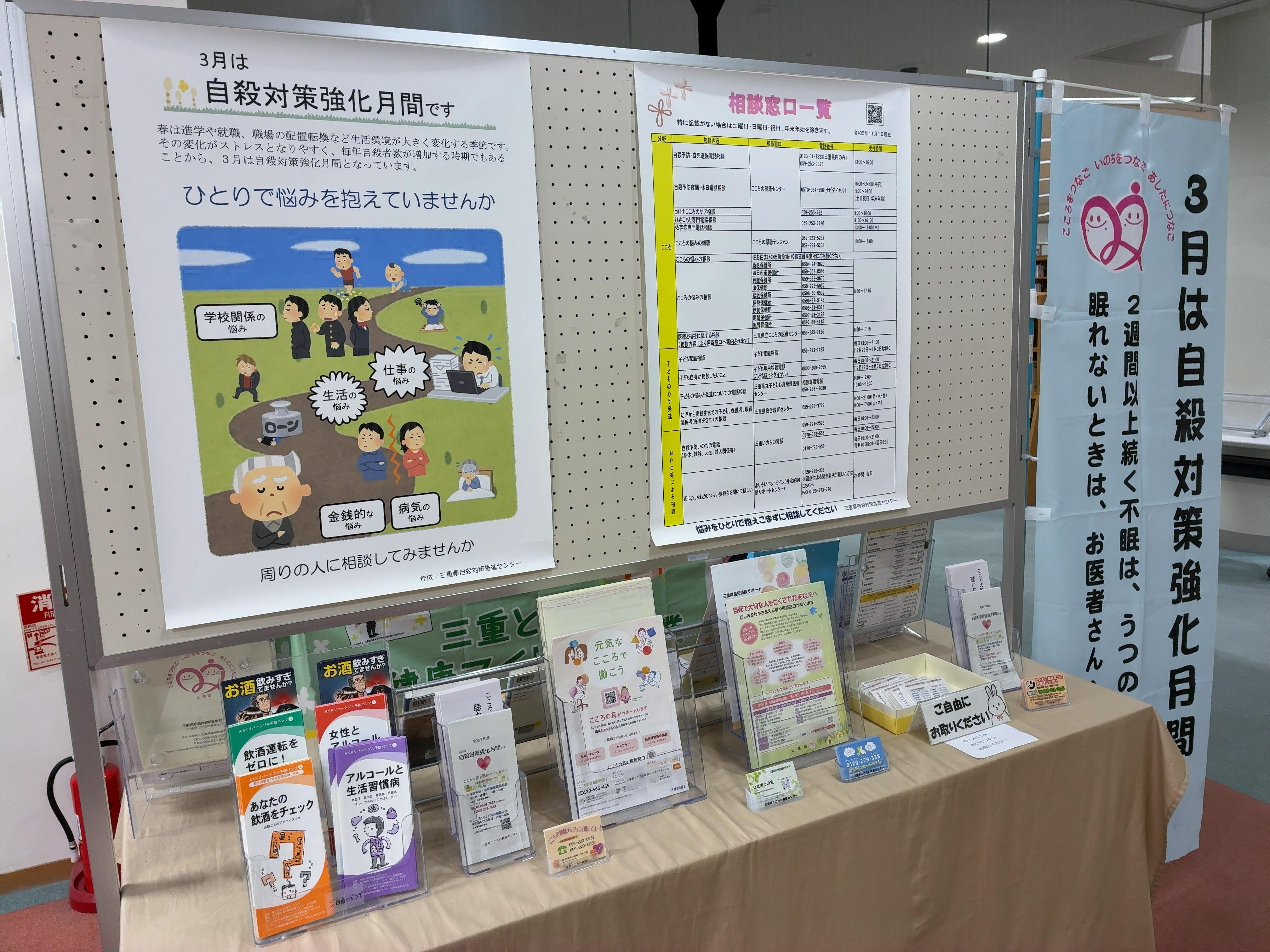 三重県立図書館では、三重県こころの健康センターと連携し、「自殺対策強化月間」に関する展示を行っています。